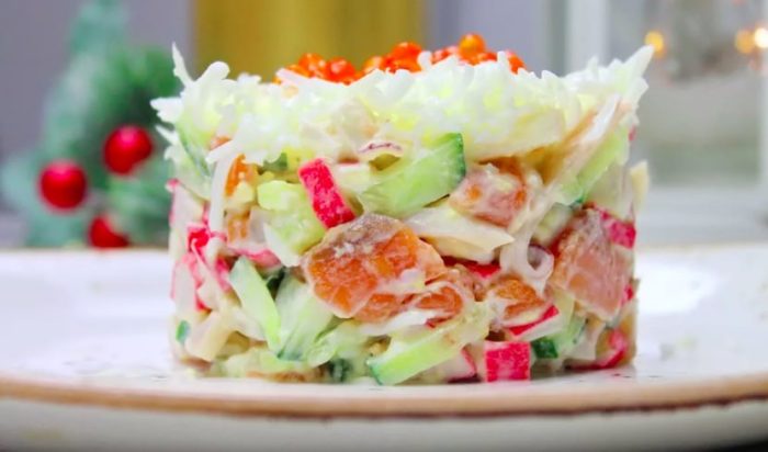 Этот салат с соленой семгой, как можно видеть на фото – идеальная закуска для торжественного застолья. Царский салат можно включать и в ежедневное меню, заменив дорогостоящую семгу горбушей.