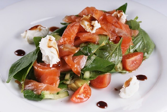 Салат с красной рыбой диетологи советуют есть не реже, чем 2 раза в неделю. Это неудивительно, потому как лосось – это настоящих кладезь полезных веществ: витаминов А и D, кальция, фосфора, а еще необходимых организму полиненасыщенных жирных кислот Омега-3.