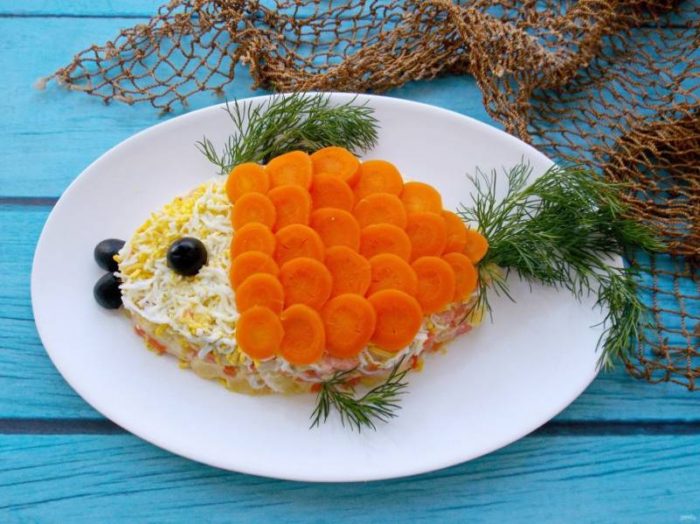 - Дно глубокого салатника закрывают пищевой пленкой, после чего выкладывают салат слоями в следующем порядке: измельченные яйца – морковь – рыба – маслины – крабовые палочки (после очередного слоя делают майонезную сетку).