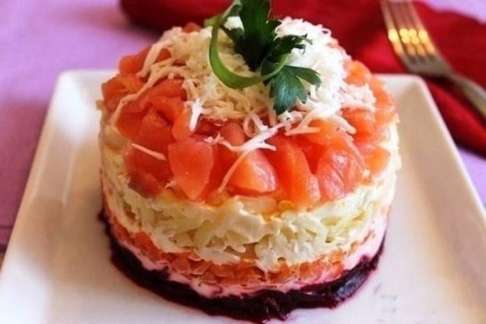 Это вкусный нежный салат из семги, который выкладывается слоями. Традиционная подача в сочетании с пикантным вкусом понравится гостям. Закуска станет украшением праздничного стола.