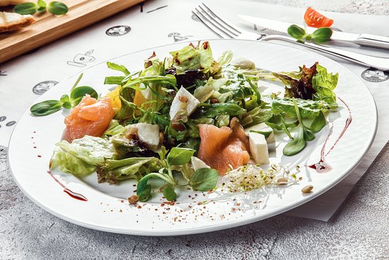 - Полейте салат с семгой оливковым маслом и по вкусу бальзамическим соусом.