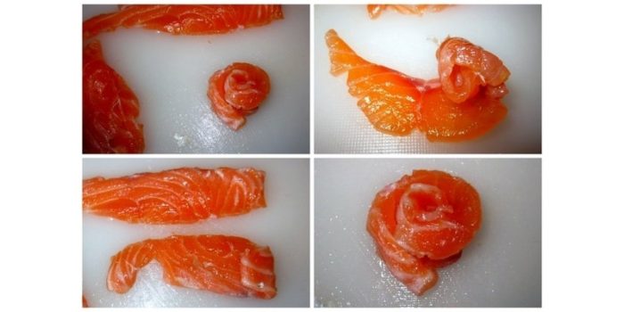 Оставшиеся 100 гр рыбки порежьте тонкими пластинами и заверните каждый вокруг оси. Должны получиться розы. Сбрызните соленую рыбку соком лимона. Отправьте салат с семгой на несколько часов в холод