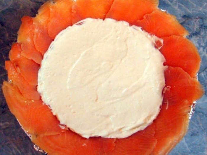 150 грамм красной рыбки распределяем кольцом.