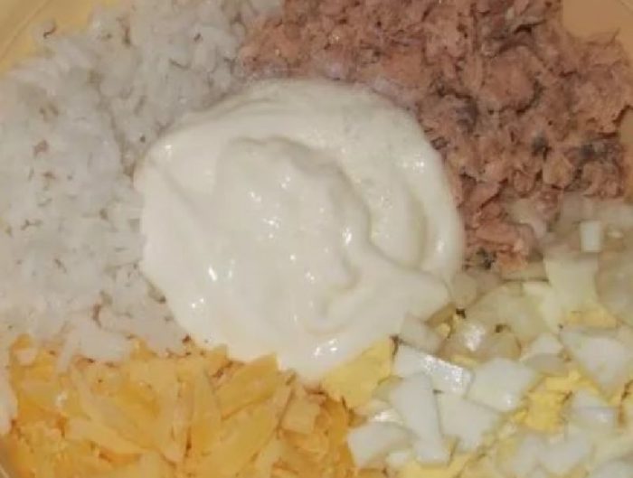 Классический салат с горбушей консервированной и рисом