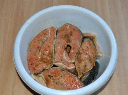 - Стейки рыбы замариновать. Для этого их нужно заправить перцем, натереть травами и подождать 10 минут.