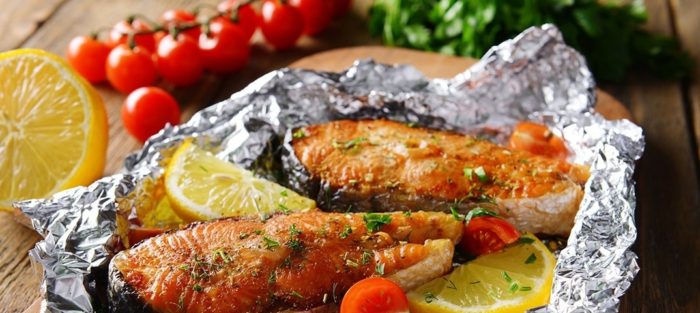 - Пока можно сделать лодочки из фольги, куда позже нужно положить рыбу. Туда же отправляются остатки от маринада и после блюдо ставится в духовку, нагретую до 180 градусов. Запекаться рыба будет 15 минут. Затем лодочки открываются, и семга жарится ещё 7 минут.