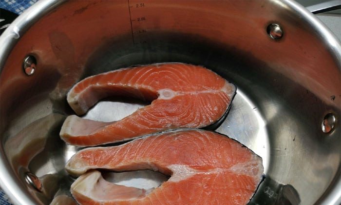 Теперь нужно взять достаточно глубокую посуду. Подойдёт и обычная кастрюля, главное, чтобы в неё помещались стейки семги. Когда первый стейк будет уложен нужно полить его получившимся ранее маринадом.