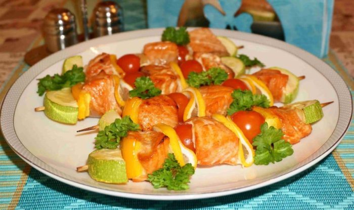 - После того, как с маринованием будет покончено, можно нанизывать рыбу на шпажки и отправлять в духовку. Жарится шашлыки должны на решётке при 230 градусах по Цельсию. Время прожарки – 10 минут. Главное постоянно проверять рыбу и смотреть сколько времени осталось, иначе можно пересушить мясо.