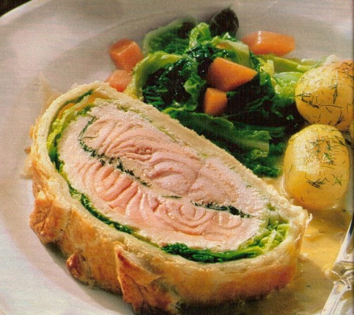 Запечённая в духовке семга в слоёном тесте прекрасно подойдёт для зимних завтраков. Тем более что готовиться она быстро если приготовить тесто заранее.