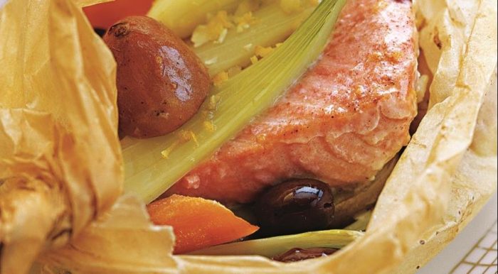 - Надо подготовить четыре листа пергамента для выпечки, положив их друг на друга, а посередине положить снизу-вверх: немного цукини, фенхель, каперс, протёртая цедра, сверху всё залить лимонным соком. Также стоит добавить немного сливочного масла и сверху поместить ветку укропа. Теперь черёд рыбки. Добавить ещё соли и перца, добавить сверху несколько кружков лимона и в завершение вешку укропа.
