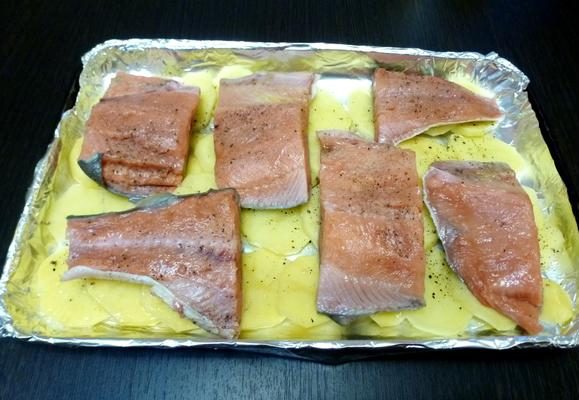 - Сверху картофельного слоя выложите рыбу. Можно приправить ее солью, перцем.