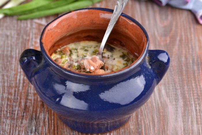 - Сверху положите майонез или сметану. В каждый горшочек по рецепту вливается немного воды, затем крышка закрывается, и блюдо отправляется готовиться в разогретую до 180 градусов духовку на 50 минут. Готовность горбуши в горшочке можно проверить, используя шпажку.