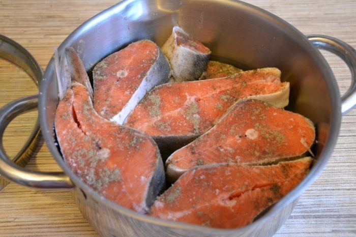 - Выложите в нее горбушу, немного поперчите, посолите.