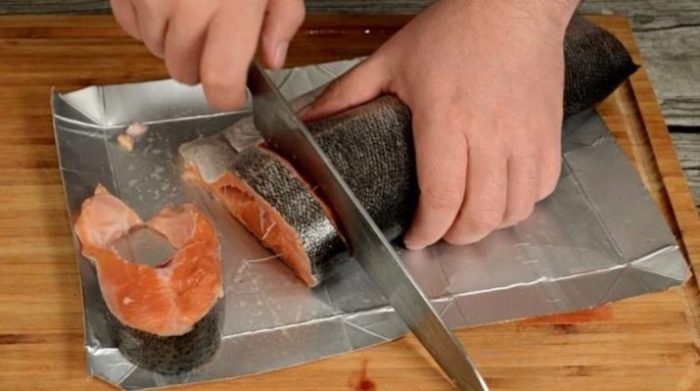 - Порежьте горбушу кусочками любой формы. Смажьте их соком лимона.