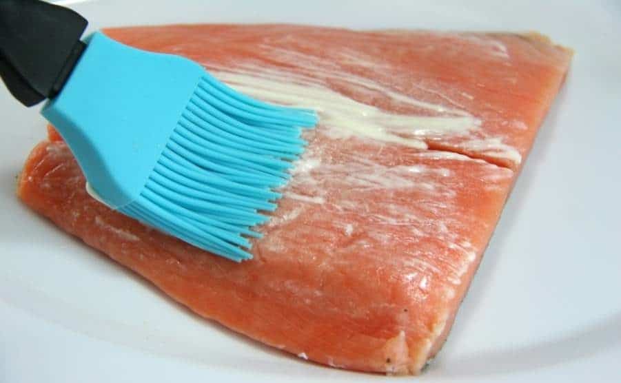 Рыбу смазывают смесью из майонеза и остальных приправ.