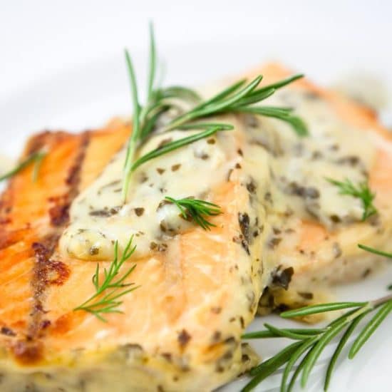 Данный рецепт запеченного стейка лосося является классическим и имеет те или иные вариации в разных национальных кухнях. Сливочная составляющая придает особую нежность и мягкость рыбе. Она служит своеобразной подливкой. Поэтому, если подать рис или отварной картофель к этому блюду, то жидкая составляющая прекрасно дополнит гарнир. Процесс приготовления рецепта занимает приблизительно 35-40 минут. КБЖУ на 100 г составляет: