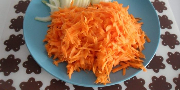 Для начала необходимо почистить, нарезать или потереть на крупной терке морковку и лук