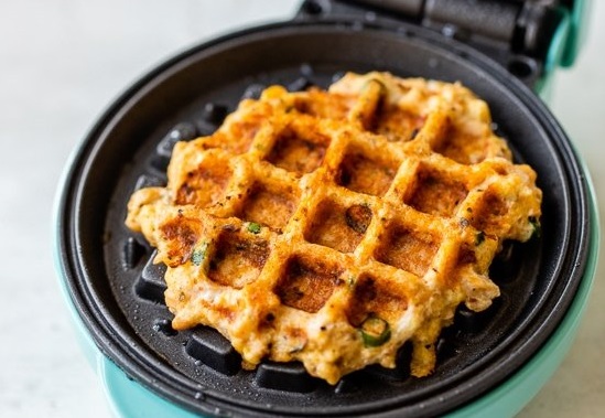 Нагрейте вафельницу, сбрызните каплей оливкового масла. Выложите четверть массы и закройте крышку. Жарьте до румяной корочки 3-4 минуты. Таким же образом пожарьте остальные вафли (по 2 на порцию). Если у вас нет вафельницы, обжарьте на сковороде по 3 минуты с каждой стороны. Также для жарки подойдет аэрофритюрница, тогда готовьте около 6-8 минут при 200 градусах.