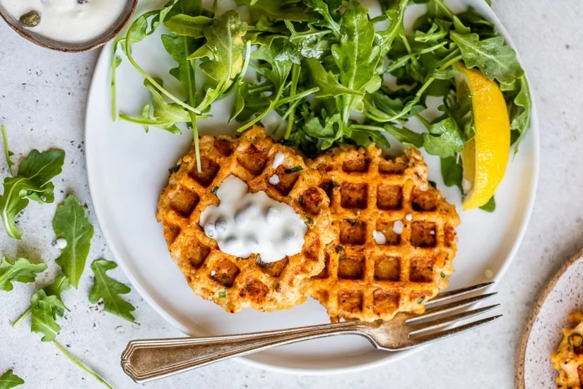 Для соуса ремулад смешайте майонез с лимонным соком и порезанными каперсами. Подавайте вафли с соусом и долькой лимона, по желанию украсьте зеленью.