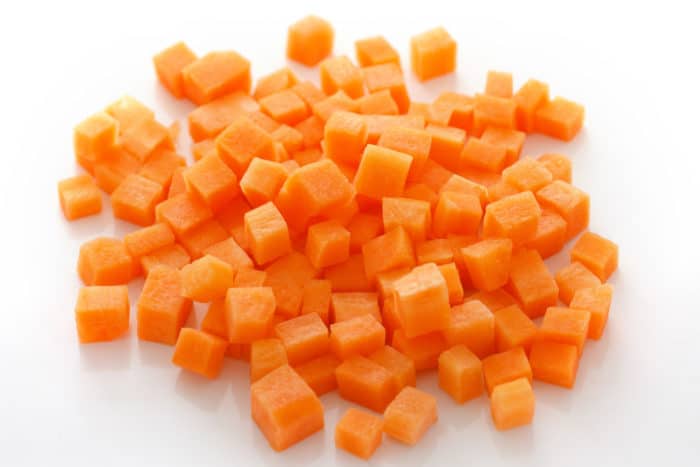 Морковка чистится и нарезается довольно крупно. Это могут быть кубики, кольца или полукольца.