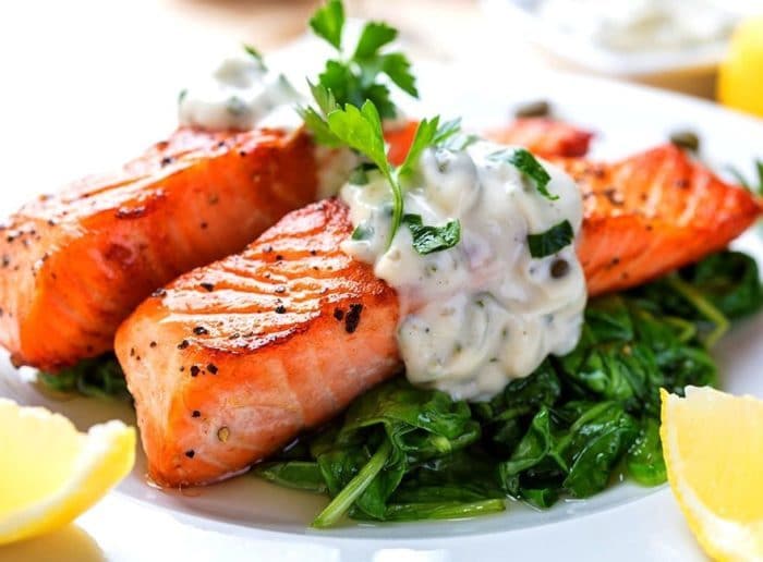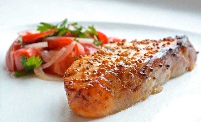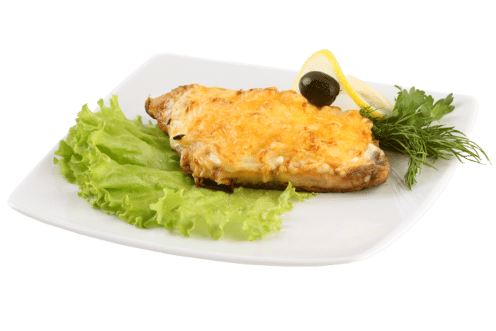 Такая рыба подаётся с зеленью и будет вкусной как в горячем, так и холодном виде. В 100 граммах 130 ккал, БЖУ — 19,2/6,1/1,8.
