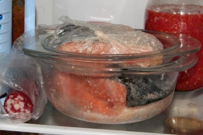 Нельзя для размораживания рыбы использовать тёплую воду или микроволновую печь. Она должна оттаивать постепенно в холодильнике.