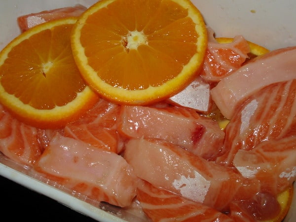 - Нарезанные апельсины переложить к филе, перемешать и убрать на ночь в холодильник.