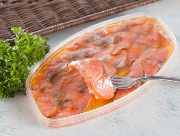 - Уложить рыбку в подготовленную ёмкость. Между слоями залить растительное маслице. Убрать в холодильник на 30 минут.