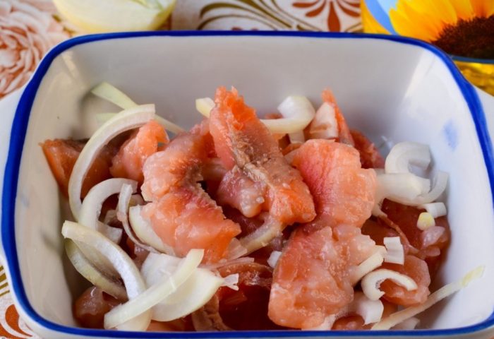 - Кусочки рыбы выложить в форму или контейнер, после чего залить их остывшим рассолом.