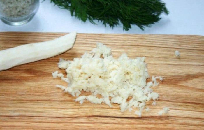 - Измельчить с помощью блендера или тёрки корень хрена и положить в рассол.