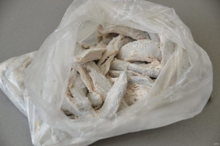 - Положить очищенные тушки в полиэтиленовый пакет с мукой и хорошенько перемешать, затем посолить и поперчить по вкусу.