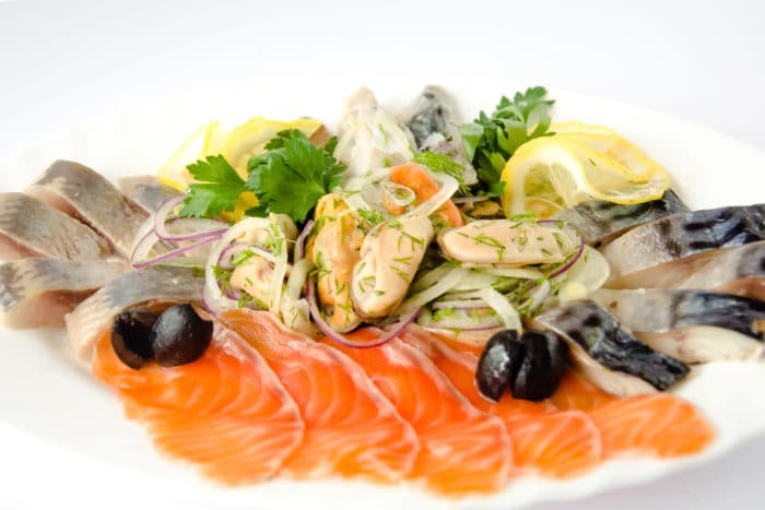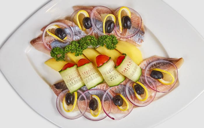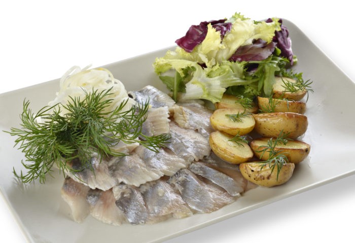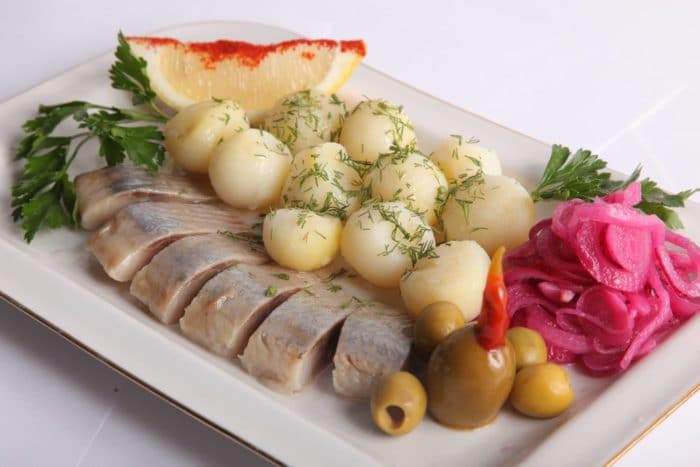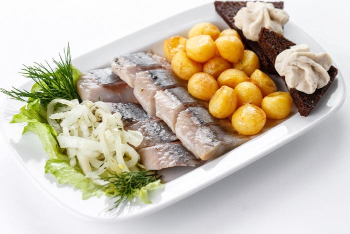 Подавать селёдку также часто предлагают с лимоном, луком (как зелёным, так и репчатым), оливковым маслом, оливками и черным хлебом. О напитках можно не упоминать – сельдь и водка считаются единственной и наилучшей парой.