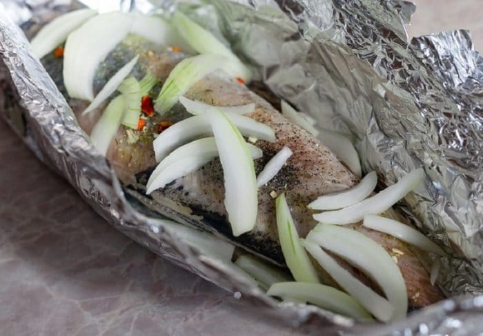 На фольгу выкладываются остатки начинки, кусочек сливочного масла, а сверху рыбы – они должны быть натёрты специями, солью. Чтобы начинка не вываливалась, можно закрепить края тушки зубочистками.
