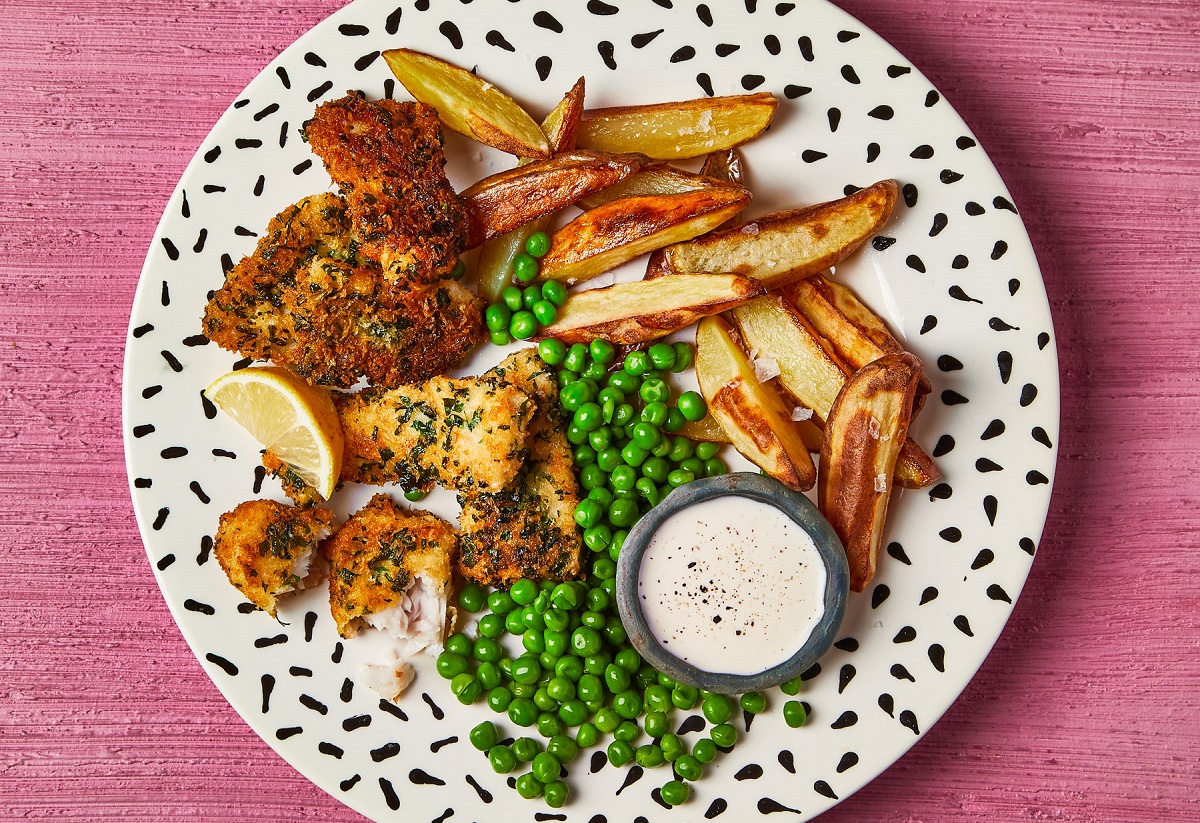 Мы немного адаптировали рецепт к домашним условиям и предлагаем приготовить рыбные палочки в панировке с запеченными картофельными дольками и соусом айоли. Фритюрница не понадобится.