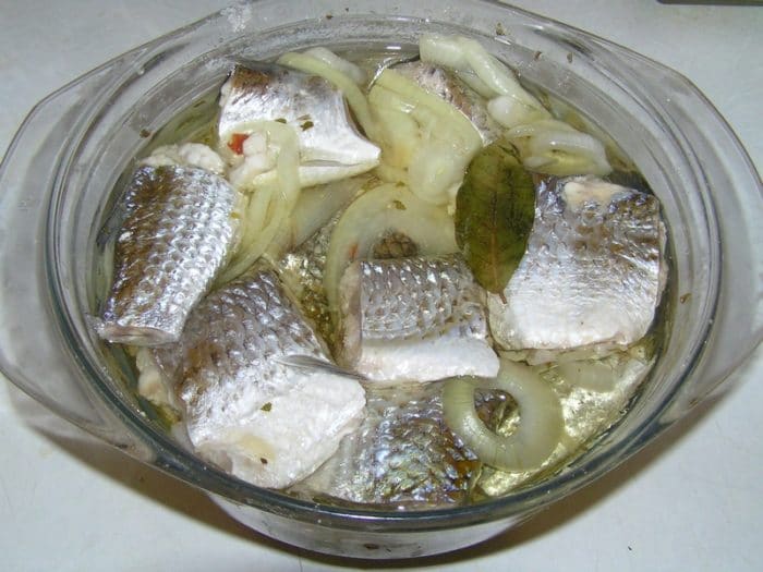 Все компоненты прокипятить с водой, остудить и вылить в подготовленную рыбу. Выдержать в течение 5 суток.