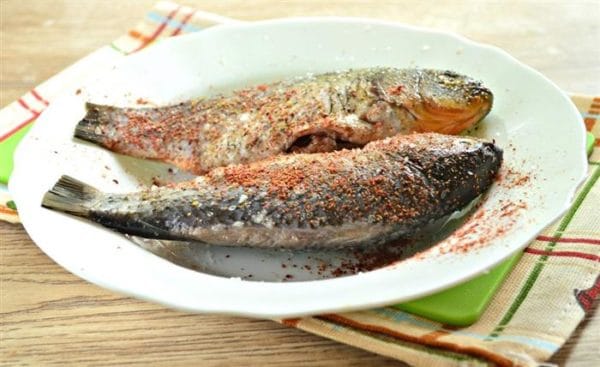 Натереть рыбу внутри и снаружи солью и черным молотым перцем.