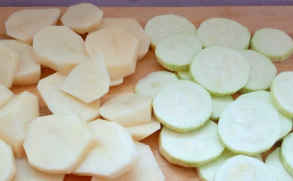 Срезать кожуру с картофеля и кабачка, вымыть и покрошить небольшими кружками.