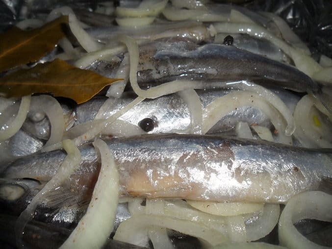 Теперь необходимо сложить все чистые тушки рыбы в отдельный контейнер, в котором будет готовиться маринад. Вся рыба должна полностью поместиться в контейнер.