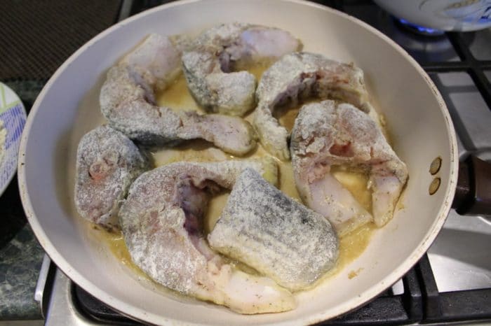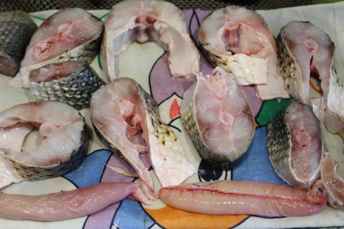Прежде чем приготовить эту рыбу, необходимо почистить ее от чешуи и внутренностей, а затем нарезать на кусочки средней толщины. Правильно разделанная рыбка должна выглядеть как на следующей фотографии.