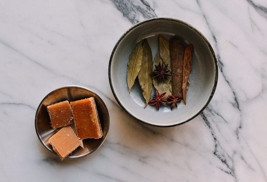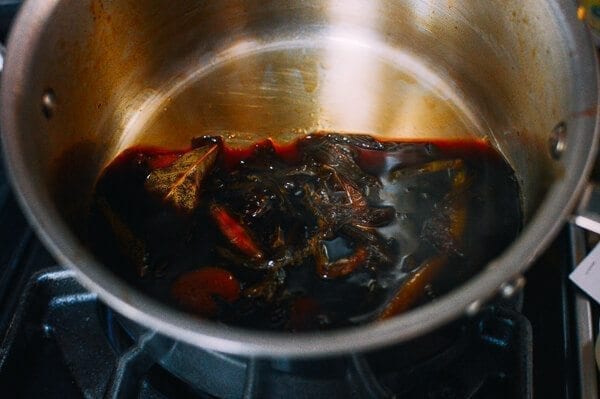 Для приготовления соуса подготовьте кастрюлю, влейте в нее 700 мл воды, добавьте кусочки имбиря, лавровый лист, звездочки аниса и палочку корицы. Поставьте на огонь и доведите до кипения. Когда вода закипит, убавьте огонь до минимума, накройте крышкой и варите в течение 15 минут. Затем выловите анис и корицу.