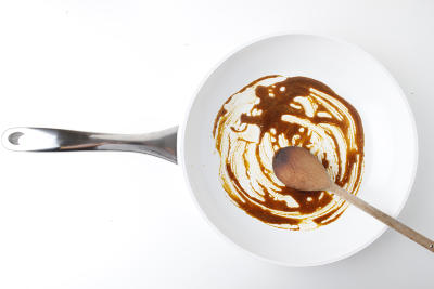 На средне-низкий огонь поставьте глубокую сковороду с антипригарным покрытием, добавьте половину сливочного масла. К маслу добавьте карри и готовьте 30 секунд, постоянно помешивая. Затем переложите получившуюся смесь в миску. Сковороду вытрите.