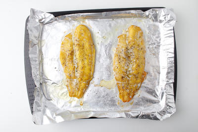 Противень застелите фольгой. Филе пангасиуса натрите солью и перцем и сбрызните оливковым маслом. Отправьте рыбу запекаться в духовке на 12-15 минут.