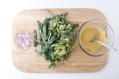Зеленый лук мелко нарежьте. Салатные листья промойте и обсушите, нарежьте на длинные полоски. Для соуса смешайте майонез с охлажденной смесью масла с карри, белым винным уксусом и 1 чайной ложкой кипятка.