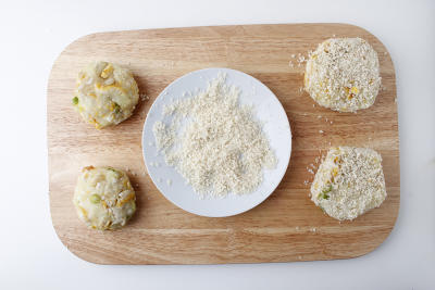 На тарелку выложите панировочные сухари. Картофель раздавите до состояния пюре. Вилкой измельчите приготовленную рыбу. Соедините рыбу с картофелем, добавьте зеленый лук, соль, перец и перемешайте. Разделите массу на 4 равные части, сформируйте из каждой котлету и обваляйте в сухарях со всех сторон.