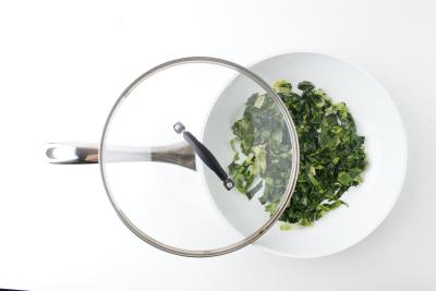 Поставьте на средне-высокий огонь сковороду с оставшейся половиной сливочного масла. Добавьте нарезанные салатные листья, посолите и жарьте 3 минуты, помешивая. Затем влейте 2-3 столовые ложки воды и готовьте еще 2 минуты под крышкой. Переложите зелень на тарелку.