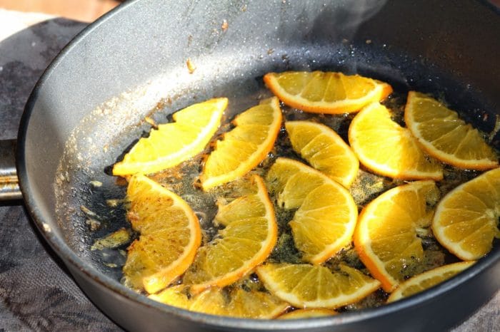 Обжарьте дольки апельсина на сковороде без масла и специй.