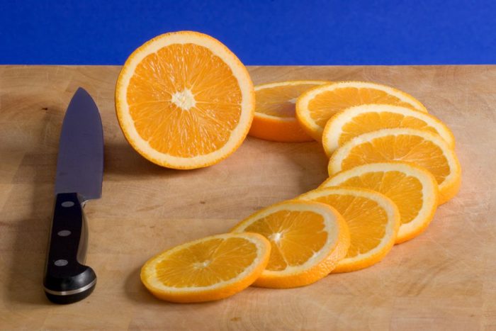 Апельсин разрежьте пополам, из одной части выдавите сок в кружку или тарелку, вторую часть порежьте на четвертинки.