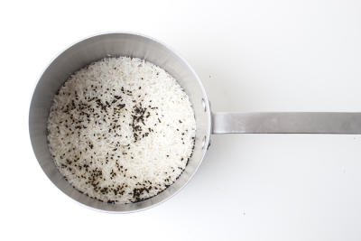 Разогрейте гриль. Тем временем в кастрюлю или ковш выложите рис, семена нигеллы, щепотку соли и залейте 300 мл воды. Доведите до кипения на сильном огне. Затем уменьшите огонь до минимума и готовьте под крышкой 12-15 минут, пока рис не впитает всю воду.