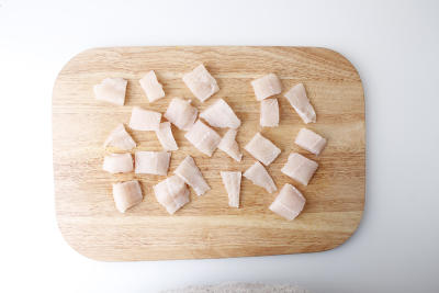 Филе пангасиуса нарежьте на средние кусочки.