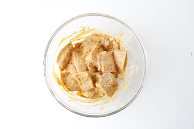 В глубокой миске смешайте половину натурального йогурта, карри, хлопья чили, щепотку соли и 1 столовую ложку оливкового масла. Добавьте в смесь рыбные кусочки и перемешайте так, чтобы пангасиус был покрыт приправами со всех сторон.